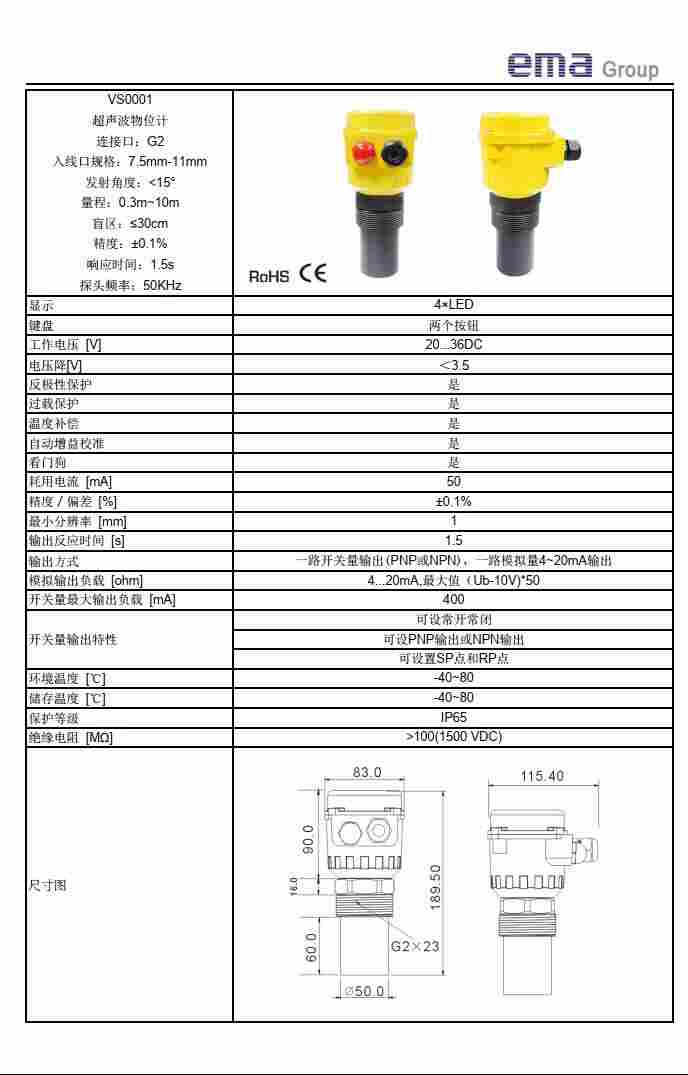 产品名称:EMA伊玛VS0001超声波液位计